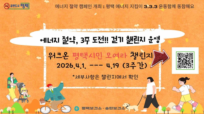 이번 챌린지는 ‘기름 한 방울 아끼는 발걸음이 건강한 평택을 만든다’는 취지로 마련됐으며, 일상 속에서 자동차 대신 걷기를 실천해 탄소 배출을 줄이고 에너지 자립도를 높이는 데 목적이 있다.