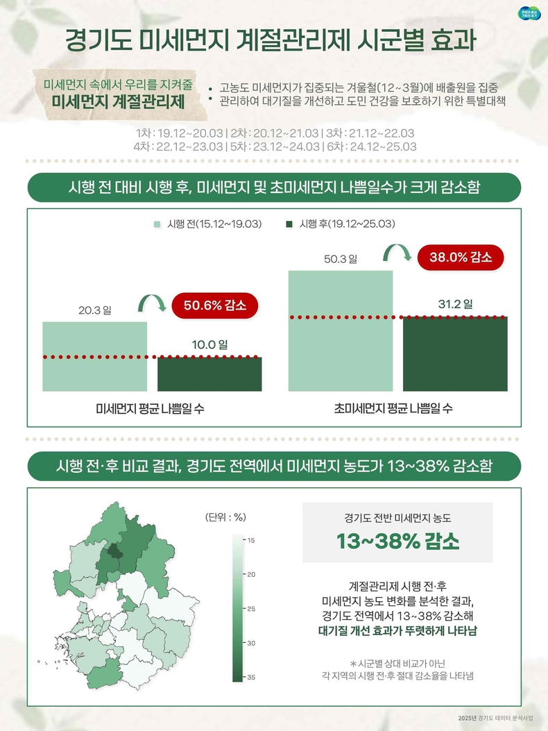 경기뉴스광장 강성규 기자 |지난 겨울 경기도 하늘이 유독 맑았던 이유가 데이터로 증명됐다. 경기도가 고농도 미세먼지 집중 시기(12월~3월)에 맞춰 시행한 ‘미세먼지 계절관리제’의 효과를 분석한 결과, 제도 시행 이전 평균 20.3일이었던 미세먼지 나쁨 일수가 시행 이후 10.0일로 ‘50.6%’ 감소한 것으로 나타났다.