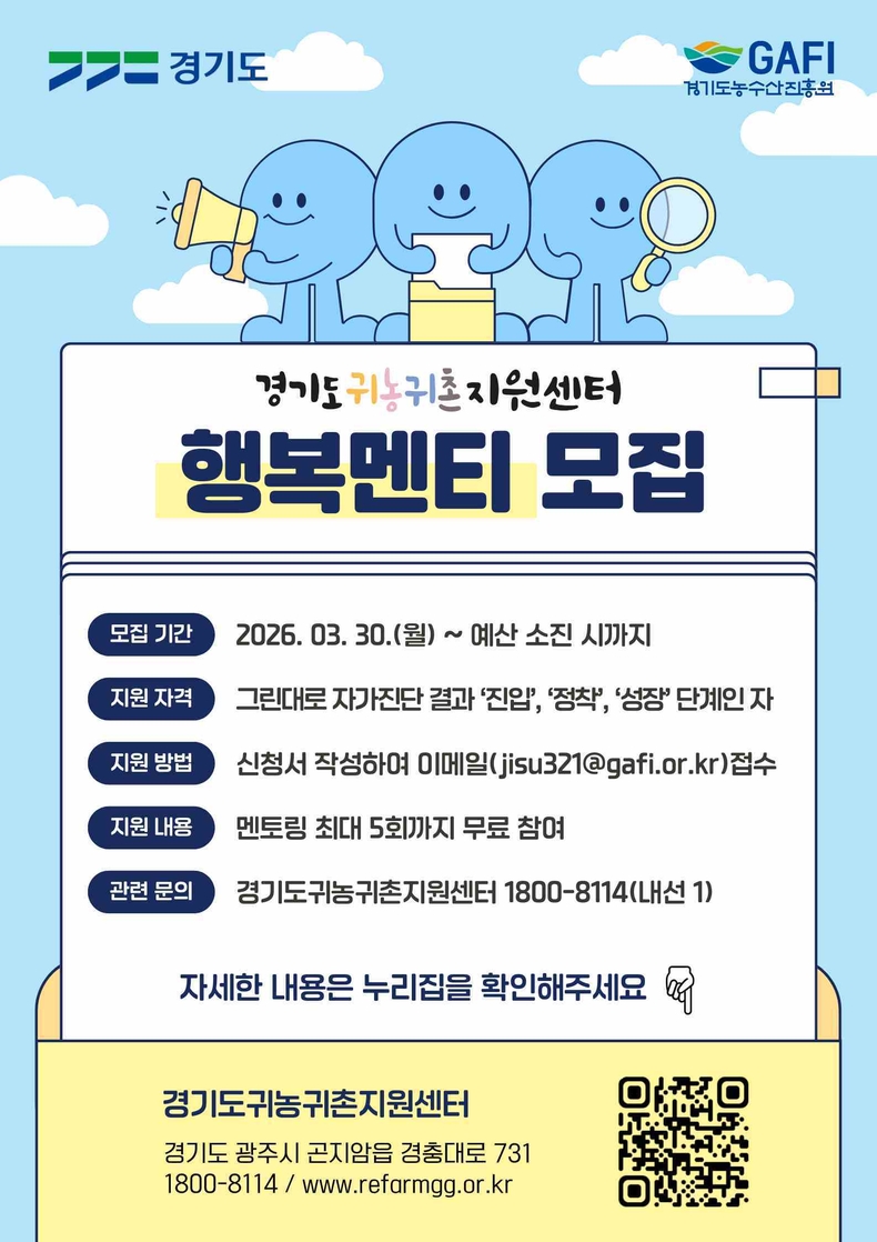 경기뉴스광장 강성규 기자 |경기도와 경기도농수산진흥원이 운영하는 경기도귀농귀촌지원센터는 경기도로 귀농·귀촌을 희망하는 도시민과 초기 정착 단계의 귀농귀촌인을 대상으로 ‘2026년 귀농귀촌 행복멘토링 행복멘티’를 상시 모집한다고 30일 밝혔다.