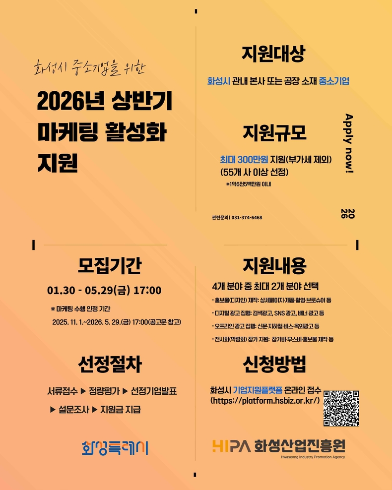 지원 대상은 화성시에 본사 또는 공장을 둔 중소기업으로, 정량평가를 통해 상반기에는 약 55개사를 선정할 계획이다. 또한, 2025년 11월1일부터 2026년 5월 29일까지 수행한 마케팅 활동을 대상으로 지원금을 지급할 예정이다.
