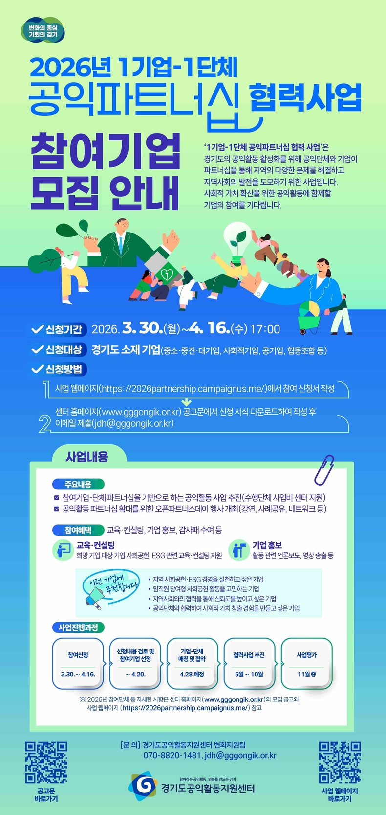 경기뉴스광장 강성규 기자 |경기도공익활동지원센터가 경기도 내 기업과 공익단체 간의 전략적 파트너십을 통해 지역 공익활동을 활성화하기 위한 ‘2026년 1기업-1단체 공익파트너십 협력사업’에 참여할 기업을 4월16일 오후 5시까지 모집한다.