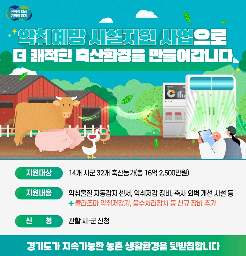 경기뉴스광장 강성규 기자 |경기도가 축산농가의 악취 문제를 예방하기 위해 악취예방 시설지원 사업의 지원 품목을 확대하고 축산환경 개선에 나선다.