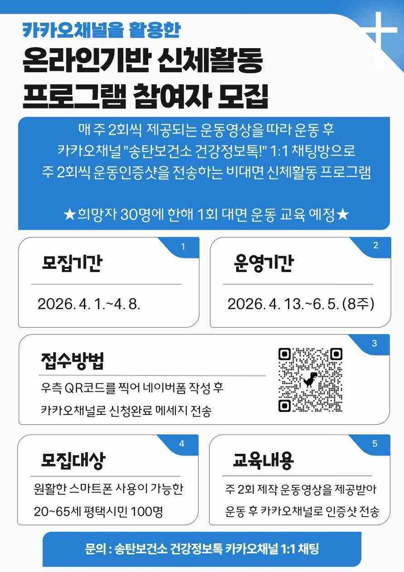 프로그램 참여 방법은 카카오톡 채널 ‘송탄보건소 건강정보톡!’을 추가한 후 네이버 폼을 통해 신청서를 제출하면 된다.