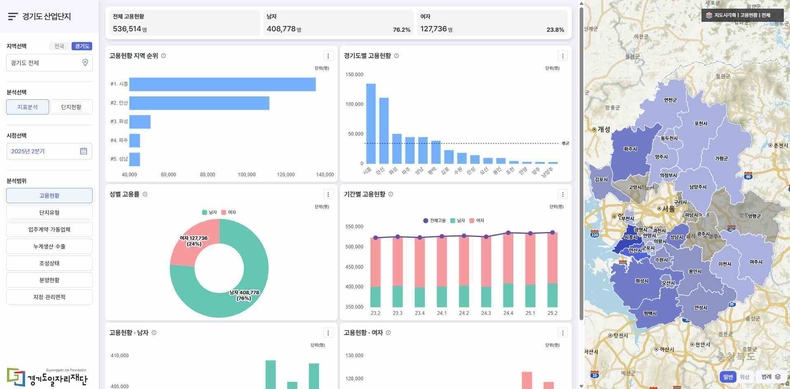 경기도일자리상황판은 고용, 산업, 경제, 인구 등 다양한 데이터를 통합해 지역별 일자리와 경제 흐름 변화를 종합적으로 파악할 수 있도록 구축된 데이터 기반 정책 지원 플랫폼이다.