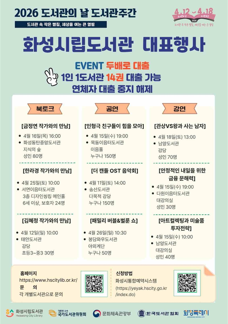 도서관주간 행사별 세부 일정과 신청 방법은 화성시립도서관 홈페이지에서 확인할 수 있으며, 화성특례시통합예약시스템에서 참가 신청이 가능하다.