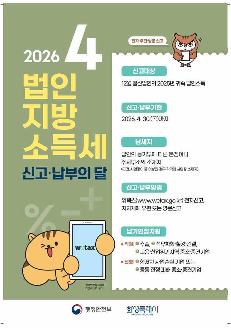 법인지방소득세는 법인이 해당 사업연도 소득을 기준으로 관할 시·군·구에 신고·납부하는 세금이다. 화성시 관내에 사업장을 둔 2025년 12월 결산 법인 중 법인세법에 따른 납세의무가 있는 법인은 오는 4월30일까지 과세표준 및 세액을 신고하고 납부해야 한다.