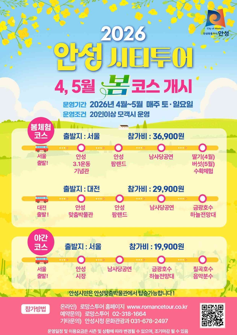 이번 시티투어는 매주 토요일과 일요일에 운영되며, 봄철 안성의 대표 관광지와 체험 프로그램을 연계한 코스로 구성돼 가족, 연인, 친구 단위 관광객들에게 특별한 추억을 선사할 예정이다.