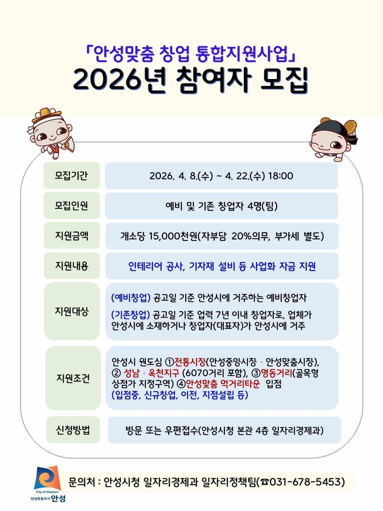 경기뉴스광장 정일수 기자 |안성시가 오는 8일부터 22일까지 ‘2026년 안성맞춤 창업 통합지원사업’ 참여자를 모집한다. 이번 사업은 전통시장과 골목상권에 창업을 유도함으로써 지역 상권을 활성화하고, 이를 차세대 문화·관광 자원으로 발전시키기 위해 기획됐다.