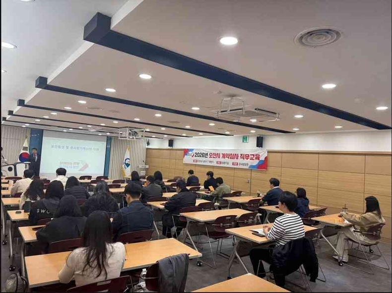 경기뉴스광장 정일수 기자 |오산시가 지난 7일 오산시청 물향기실에서 본청 및 사업소, 산하기관 발주 담당 공무원 52명을 대상으로 ‘2026년 상반기 계약심사 직무교육’을 실시했다고 8일 밝혔다.