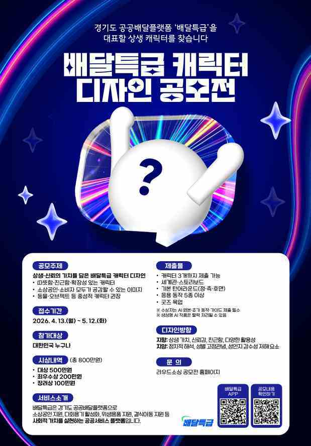 탁정삼 경기도주식회사 본부장은 “상생과 신뢰의 가치를 담은 배달특급 캐릭터를 선정하기 위한 공모로, 따뜻함과 친근함, 확장성 있는 이미지를 찾는다”면서 “선정된 캐릭터로 골목상권을 위한 다양한 온·오프라인 홍보에 나설 예정”이라고 밝혔다.