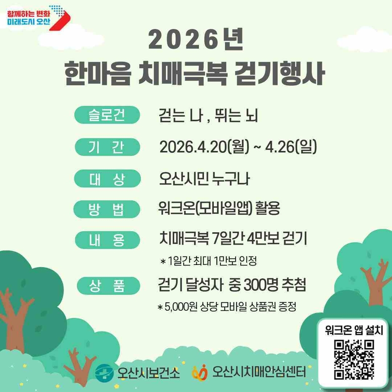 참여를 희망하는 시민은 스마트폰에 ‘워크온’ 앱을 설치한 뒤 오산시 치매안심센터 커뮤니티 ‘걷는 나, 뛰는 뇌’에 가입해 챌린지에 참여하면 된다. 7일간 목표 걸음 수는 4만 보이며, 목표를 달성한 참가자 중 300명을 추첨해 5000원 상당의 모바일 상품권을 지급할 예정이다.