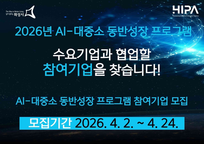 경기뉴스광장 정일수 기자 |화성산업진흥원이 대기업과 관내 중소기업 간의 상생협력 지원을 위해 공급가치사슬 전체의 경쟁력 향상을 위해 오는 24일까지 ‘2026년 AI-대중소 동반성장 프로그램’ 참여기업을 모집한다.