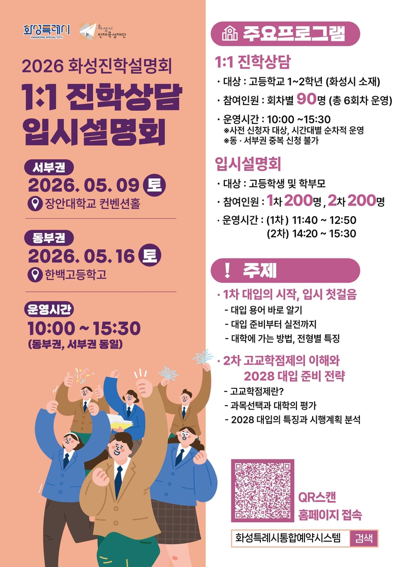 경기뉴스광장 정일수 기자 |화성시인재육성재단이 관내 고등학생과 학부모를 대상으로 ‘2026 화성진학설명회’를 개최하고, 1:1 진학상담 및 입시설명회 참여자를 모집한다.